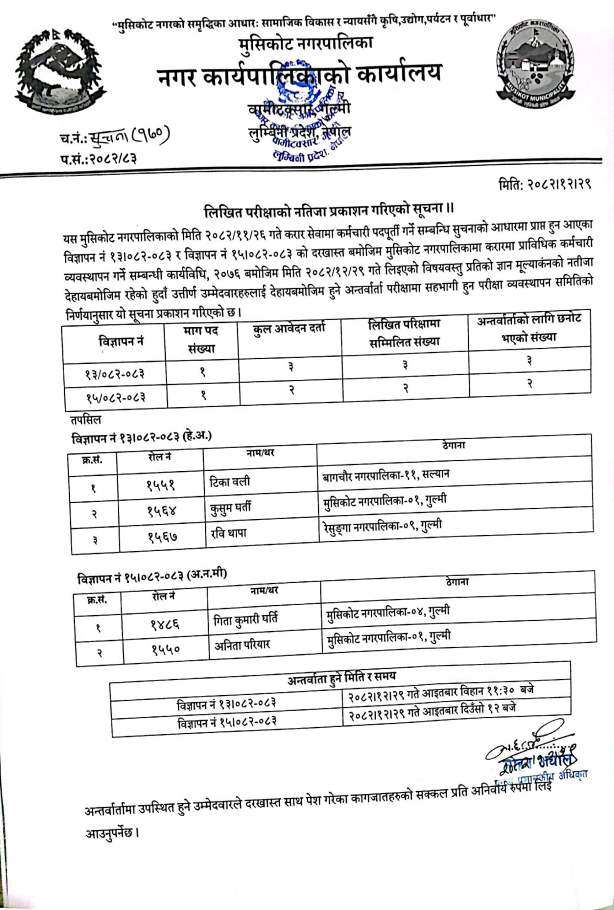 बिज्ञापन नं. १४/०८२-८३(अ.हे.व.) पदको लिखित परीक्षाको नतिजा प्रकाशन गरिएको सूचना