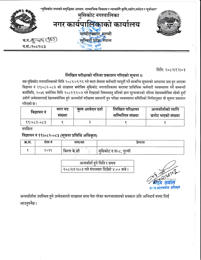 » लिखित परीक्षाको नतिजा प्रकाशन गरिएको सूचना ।