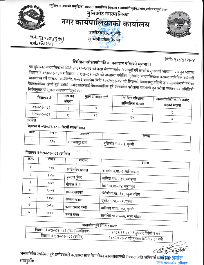 विज्ञापन नं.०९/०८२-०८३(रिटर्नी स्वयंसेवक) र १२/०८२-०८३( अमिन) पदको लिखित नतिजा प्रकाशन गरिएको