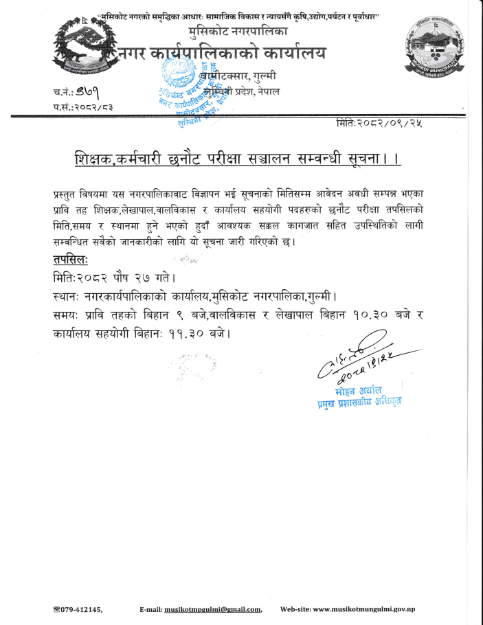 शिक्षक,कर्मचारी छनौट परीक्षा सञ्चालन सम्बन्धी सूचना ।