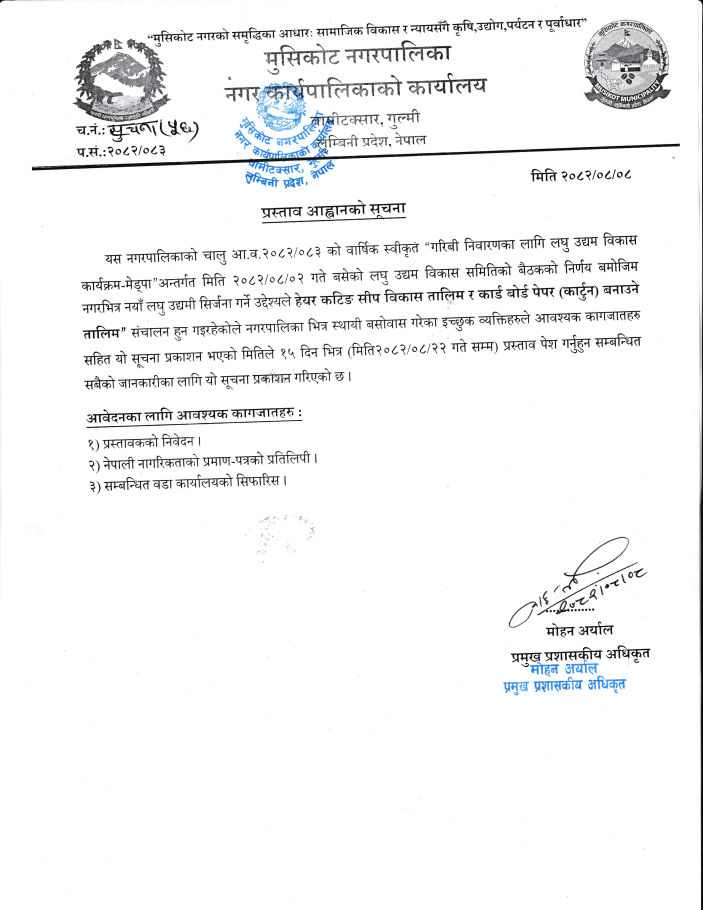 हेयर कटिङ सीप विकास तालिम र कार्ड बोर्ड पेपर (कार्टुन) बनाउने तालिमको प्रस्ताव आह्वान सम्बन्धी सूचना
