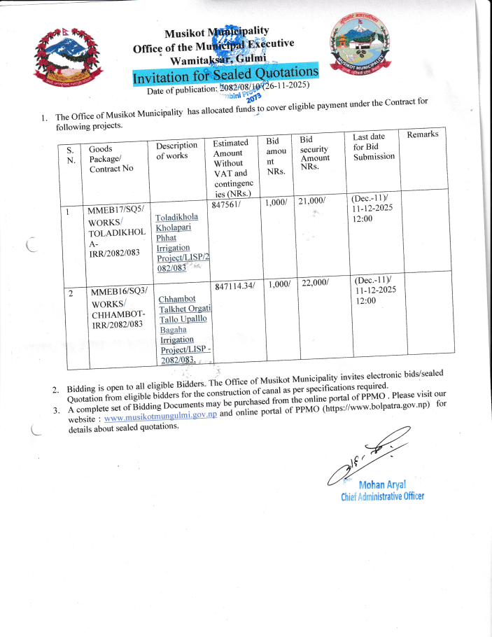 Invitation for Sealed Quotation(Jhedi Seudeni Dhabroad Sichai)