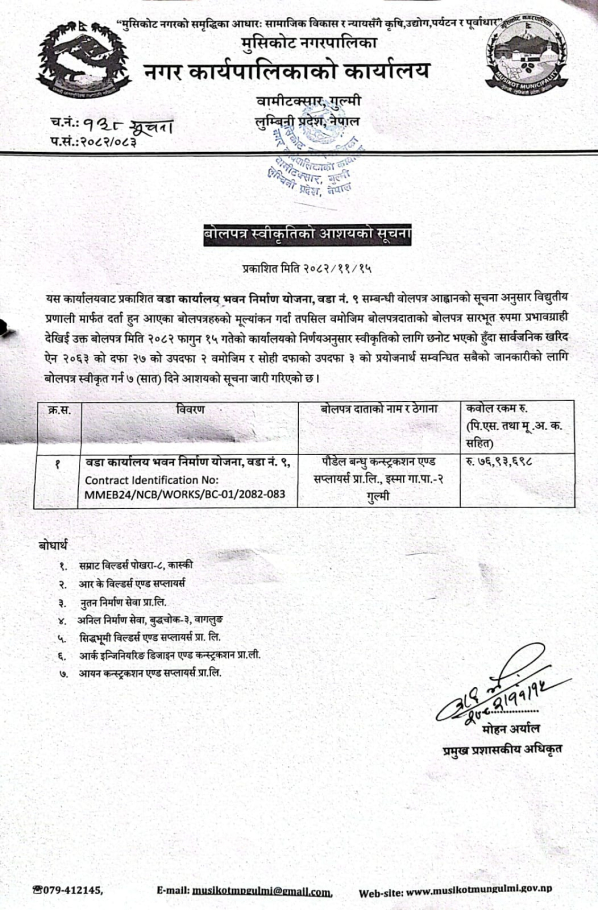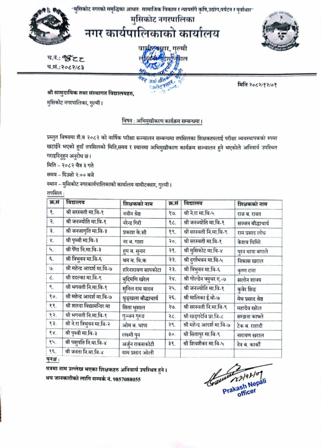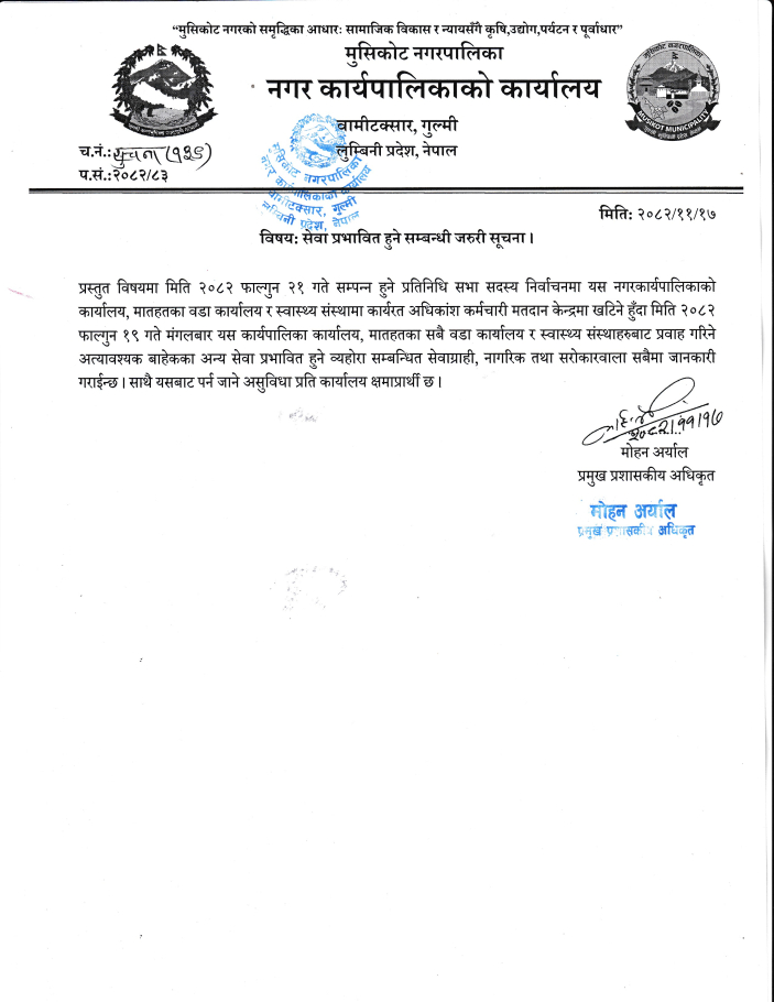 प्रस्तुत सम्बन्धमा यस नगरपालिकाद्दारा विज्ञापन गरिएको सूचना प्रविधि अधिकृत(क्ष्त् यााष्अभच) को पदमा नियुक्ति सम्बन्धी विज्ञापन यस नगरपालिकाको कार्यपालिकाको बैठकबाट सम्पूर्ण रुपमा रद्द गर्ने निर्णय गरेको हुदा सरोकारवाला सबैको जानकारीको लागि यो सूचना प्रकाशित गरिएको छ ।