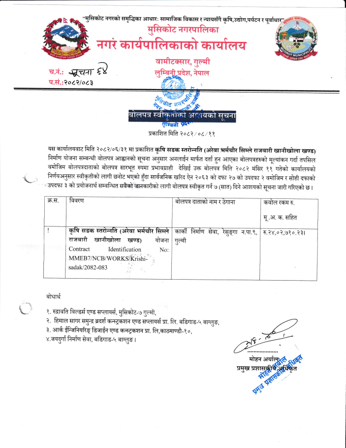 कृषि सडक स्तरोन्नति (अरेवा भर्मचौर सिम्ले राजवारी खानीखोला) सडक बोलपत्र स्वीकृतीको आशयको सूचना