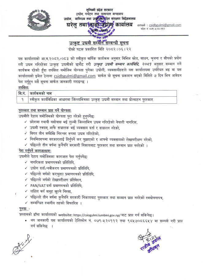 घरेलु तथा साना उद्योग कार्यालय गुल्मीको उकृष्ट उद्यमी सम्मान सम्बन्धी सूचना ।।