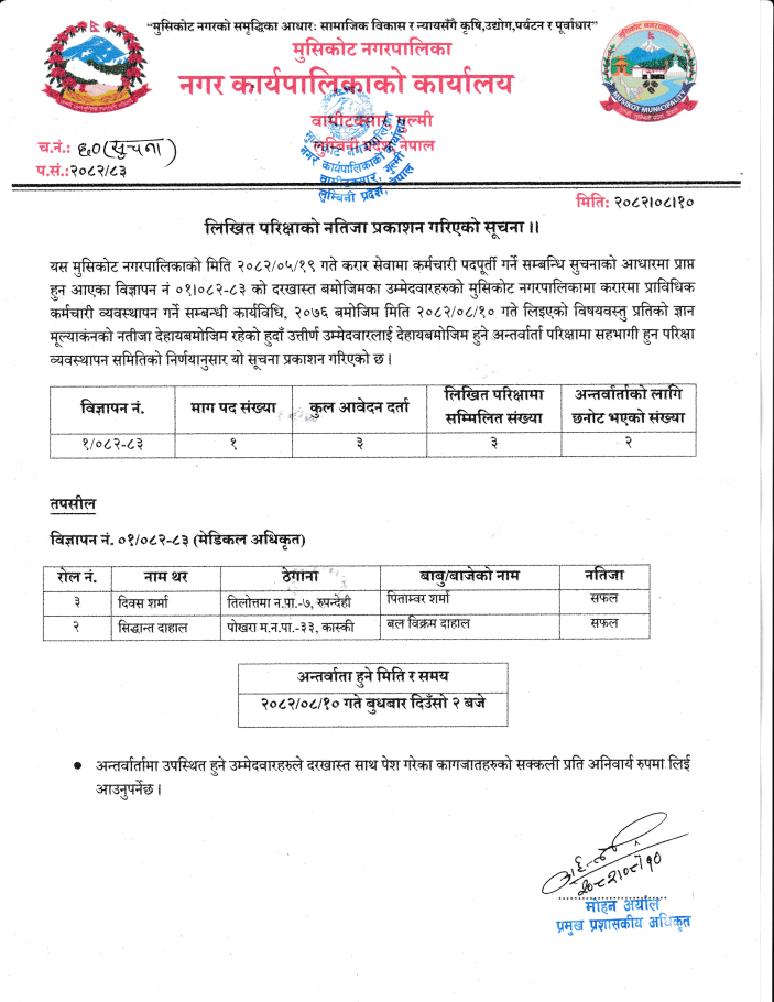 लिखित परीक्षाको नतिजा प्रकाशन गरिएको सूचना