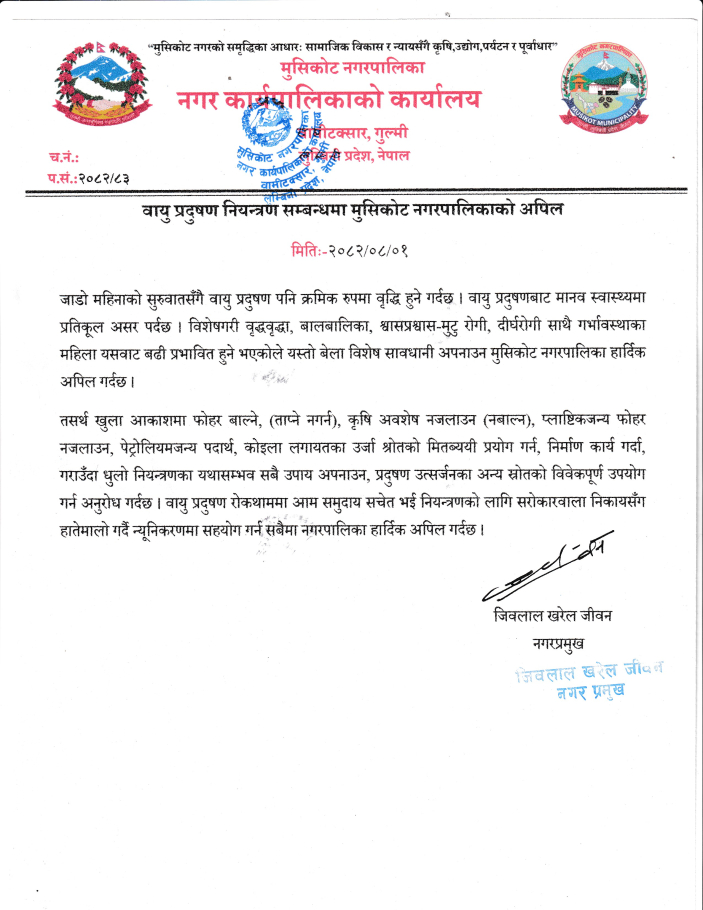 वायु प्रदुषण नियन्त्रण सम्बन्धमा मुसिकोट नगरपालिकाको अपिल