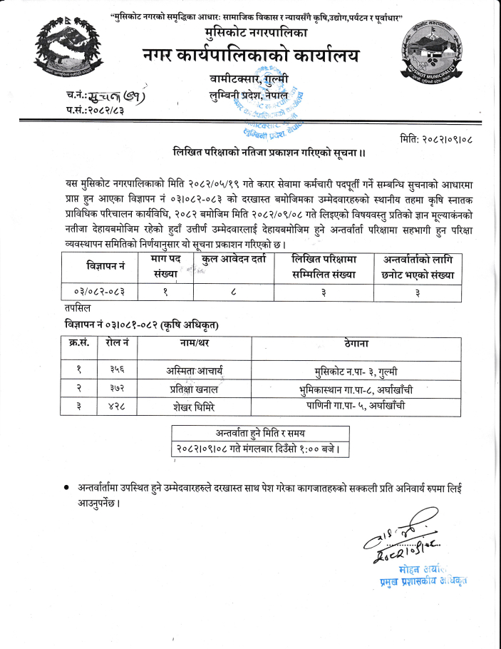विज्ञापन नं.०३/०८२-०८३(कृषि अधिकृत)को लिखित परीक्षाको नतिजा प्रकाशन गरिएको सूचना ।।