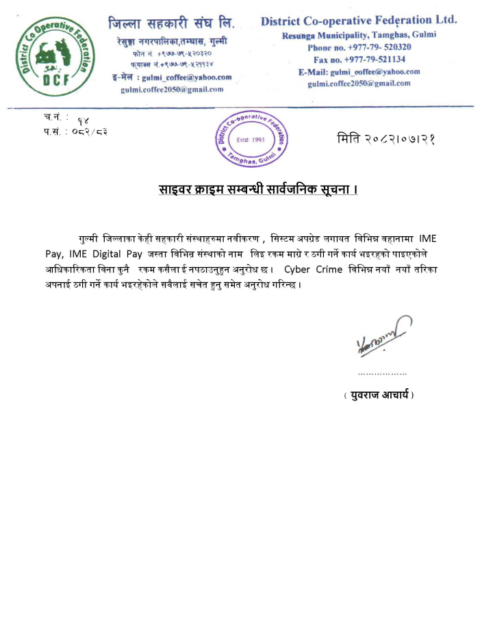 साइवर क्राइम सम्बन्धी जिल्ला सहकारी संघ लि.को सार्वजनिक सूचना ।