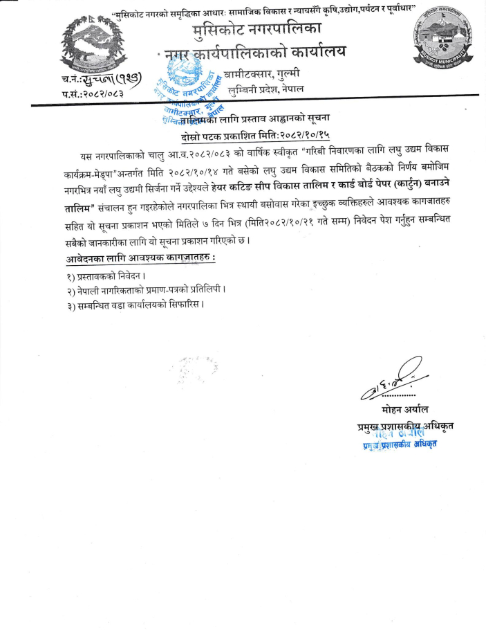 हेयर कटिङ र कार्डबोर्ड पेपर(कार्टुन) तालिममा ईच्छुक व्यक्तिले सहभागी हुनको लागी निवेदन पेश गर्ने सम्बन्धी सूचना