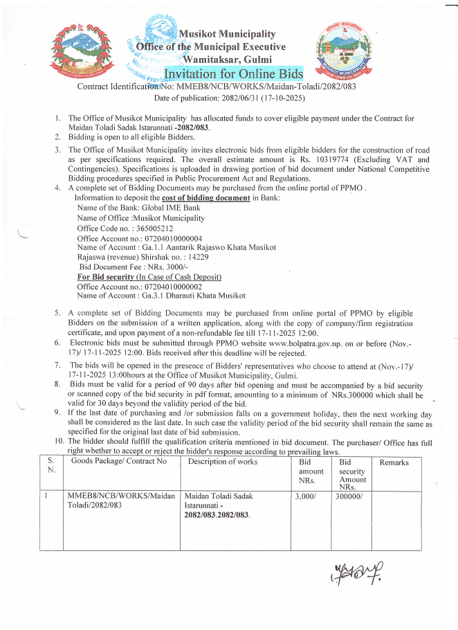 Invitation for Inline Bids(Maidan Toladi Jhedi Sadak)