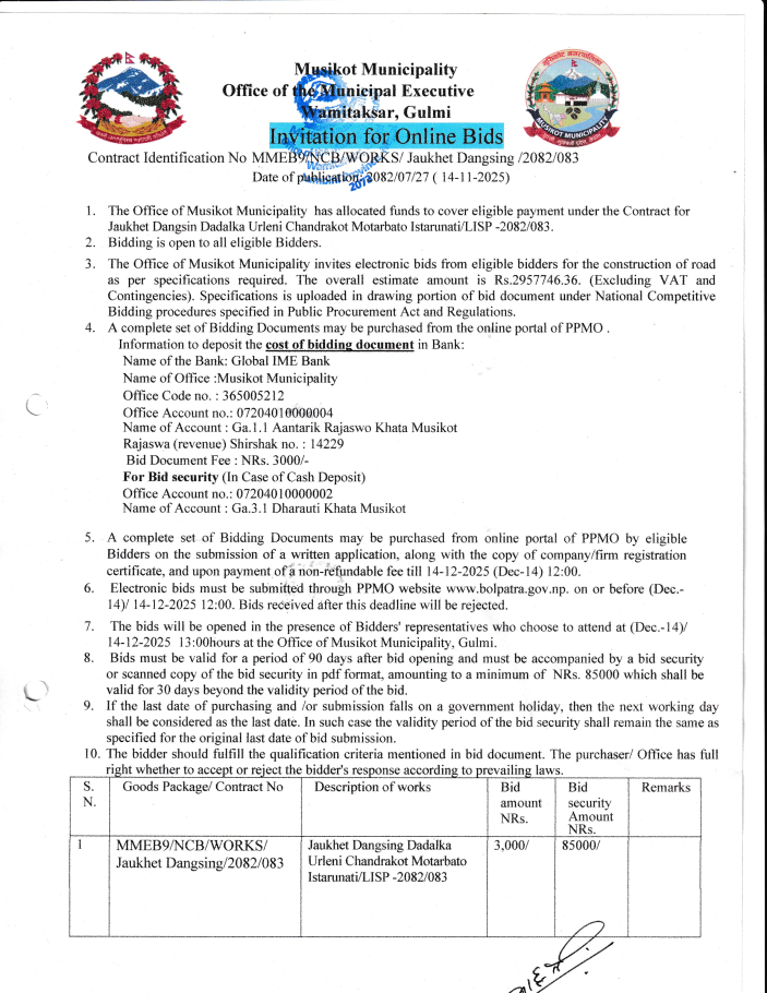 Invitation for Online Bids(Upgrading of Bhanjyang Nisti Paudi Amarai Arewa Rakse Motarbato)